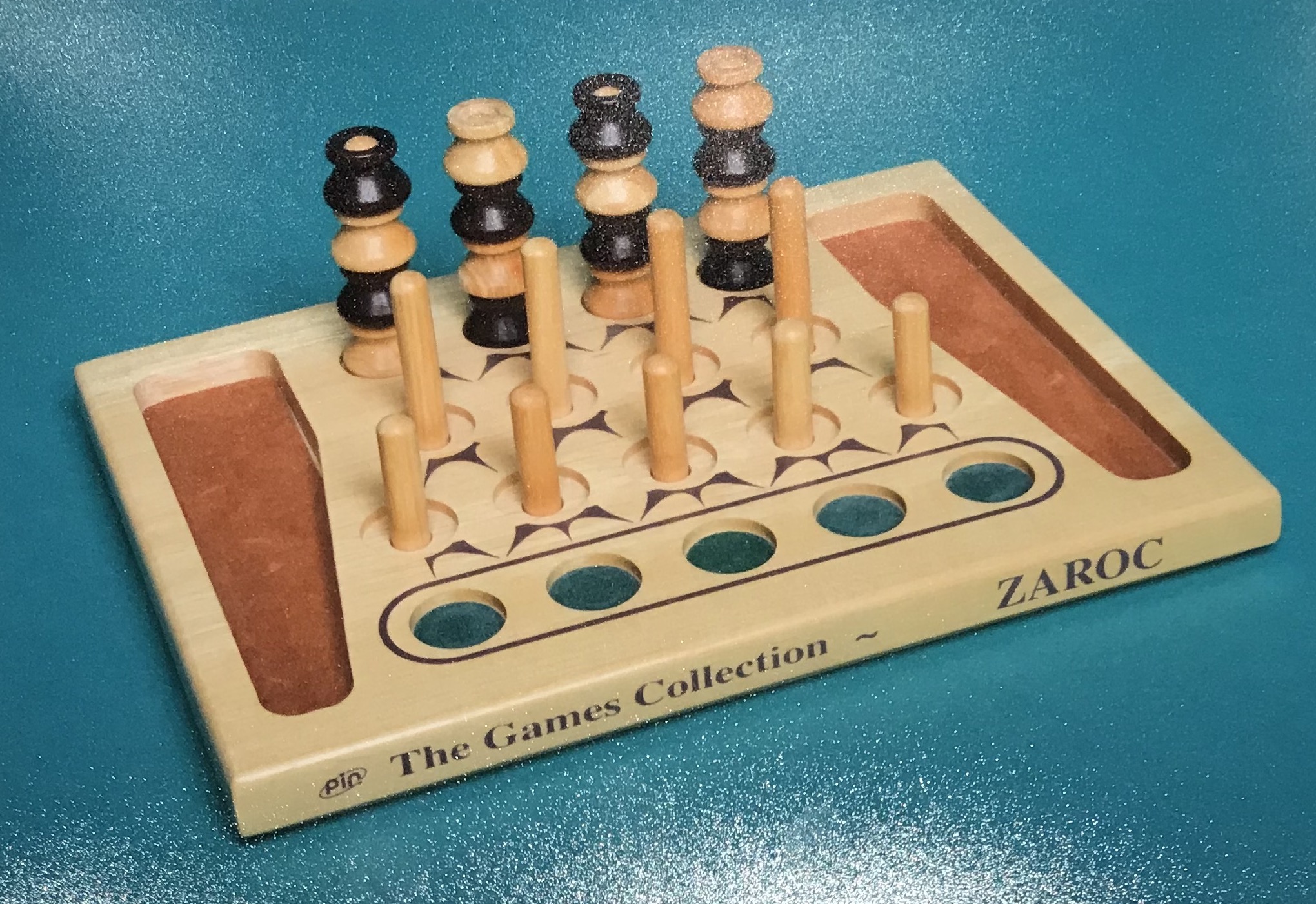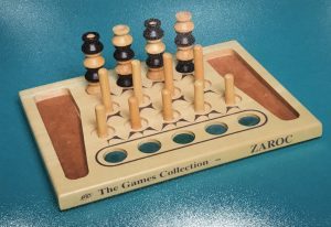 The playing pieces are of two basic types: “roundels” (disk shaped beads) and “blockers” (square-sectioned pieces). Roundels are used to score points by capping the columns, and are the only pieces that can score – but the blockers prevent an opponent from placing a roundel above them, and so may be cleverly used to reserve places for your roundels on the top!