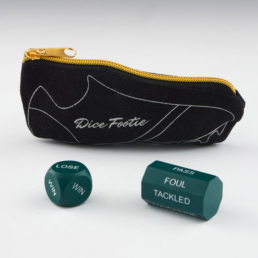 A pocket sized dice football game suitable for all ages, contains one win or lose dice used for goal scoring, and one octagonal dice referred to as the playing dice. Start by throwing the playing dice, if you throw a PASS three times in succession, you then have a chance of scoring a goal by throwing the W/L dice.